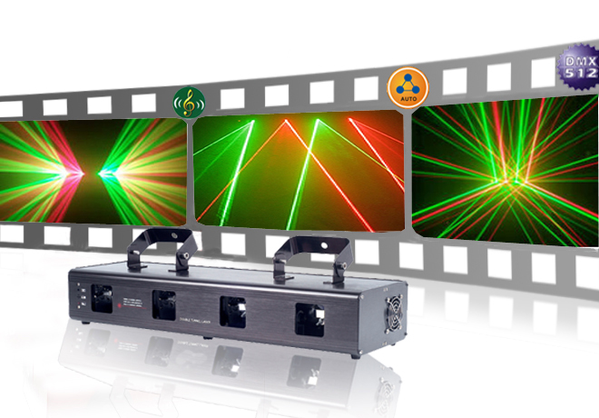 Pieces features: four head red green laser, four shots beam combination effect. One machine four models, the advanced algorithm and program design, with more than kinds of designs, powerful DMX function, can DMX signal control, and can be single or from online synchronous work. Voice control mode with acoustic control closed light function.